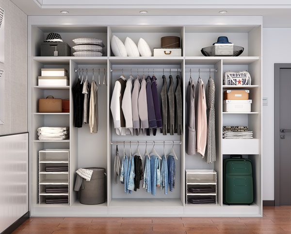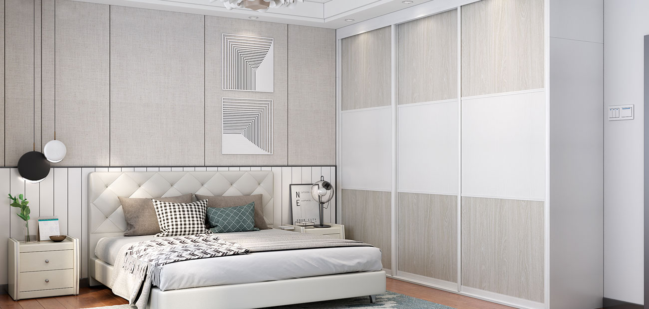 White gives your bedroom a fresh look with this 3 doors wardrobe design. The practical advantage of sliding wardrobe doors is that they don't stick out when open, that leaves you more space.