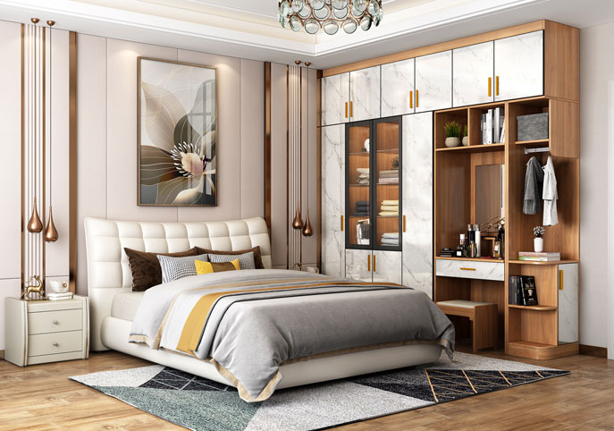 Luxurious, elegant and structured. The cultured sheen of marble finish complements the dusky sophistication of wood tones, brown color shelves and transparent glass with black frame. The floor to ceiling shelving makes sure there is space for everything.